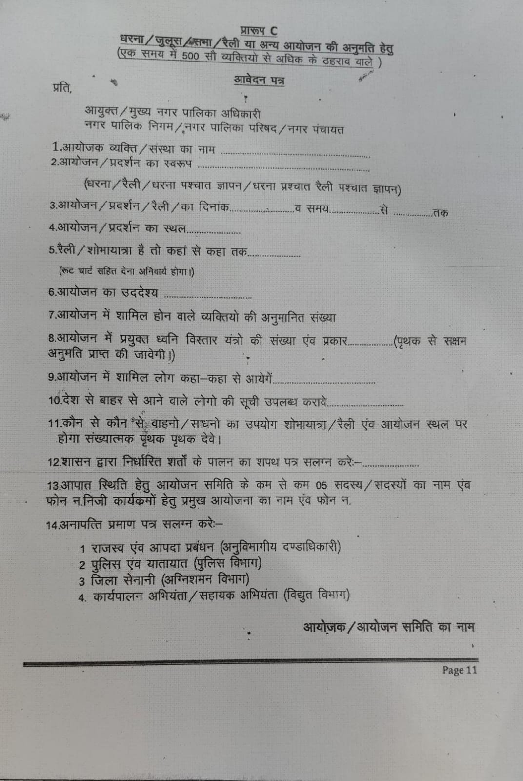 निर्धारित आवेदन प्रारूप न्यूनतम 7 दिवस पूर्व 4 विभागो का अनापत्ति प्रमाण पत्र संलग्न कर दिया जाना आवश्यक है।