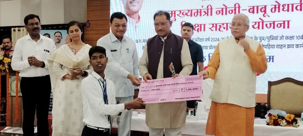 अमृत टुडे / मुख्यमंत्री विष्णु देव साय ने 15 जून को राजधानी रायपुर के न्यू सर्किट हाउस में आयोजित मुख्यमंत्री नोनी-बाबू मेधावी शिक्षा सहायता योजना के तहत कक्षा दसवीं और बारहवीं के टॉप 10 में स्थान पाने वाले पंजीकृत श्रमिकों के मेधावी बच्चों को प्रोत्साहन राशि का वितरण किया। इस दौरान मुख्यमंत्री ने भवन एवं सन्निर्माण कर्मकार कल्याण मण्डल में पंजीकृत दो हितग्राहियों के बच्चो को एक-एक लाख रूपये का चेक वितरण किया। योजना के तहत मिली राशि से स्कूटी खरीदने के लिए बच्चां के बालिग होने तक उनके खाते में एफडी के माध्यम से जमा रखा जाएगा। इनमे हितग्राही श्रमिक सीमा जोशी के पुत्र सौरभ जोशी और मोतिम की कुमारी डिम्पल शामिल हैं।